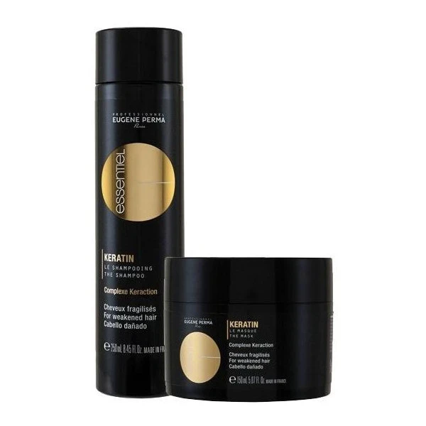 Dans le pack Essentiel Kératin d’Eugène Perma, retrouver deux produits :